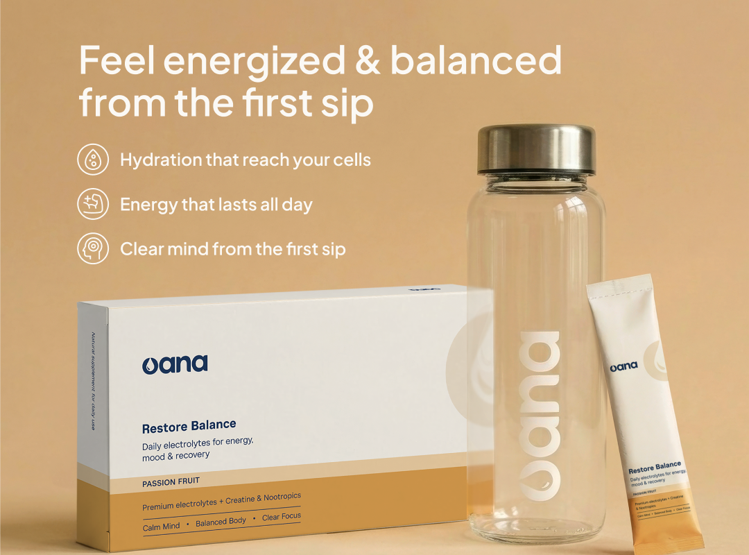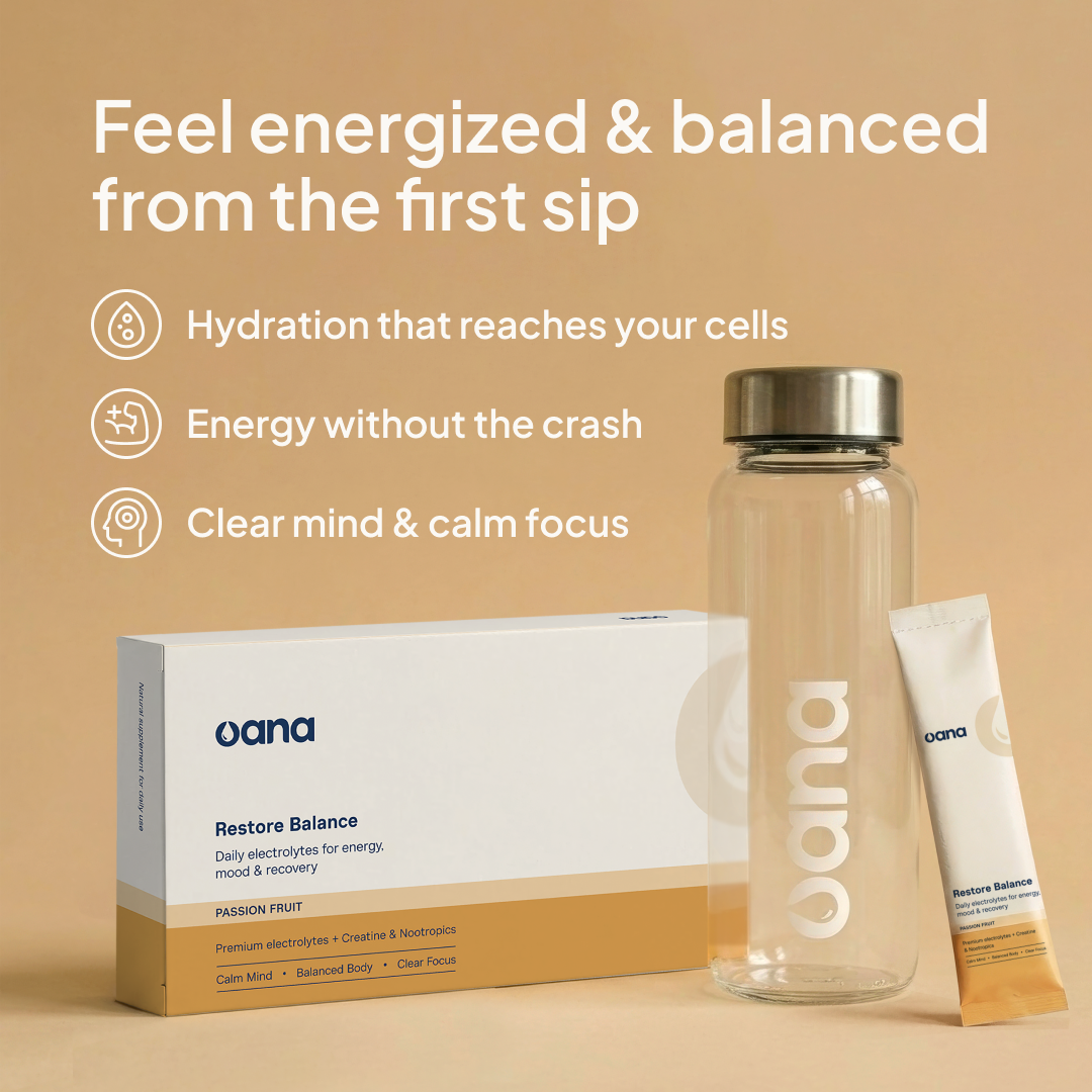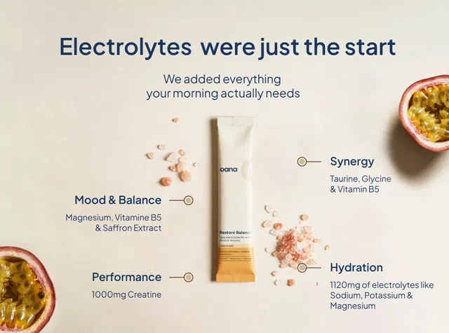 Restore Balance was built to close the gap between waking up and feeling like yourself. Most electrolyte drinks stop at minerals. They replace what you lose — and that's it.