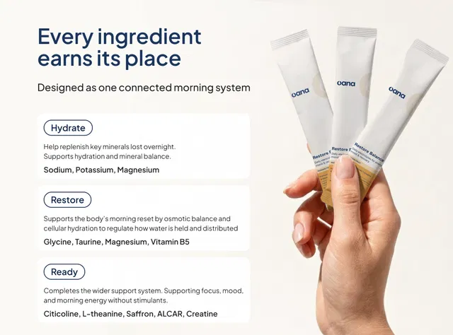 Restore Balance goes one step further. Glycine and taurine act as osmolytes, helping water and electrolytes actually reach your cells instead of passing through. That's the difference between drinking electrolytes and absorbing them. Most drinks miss that part.