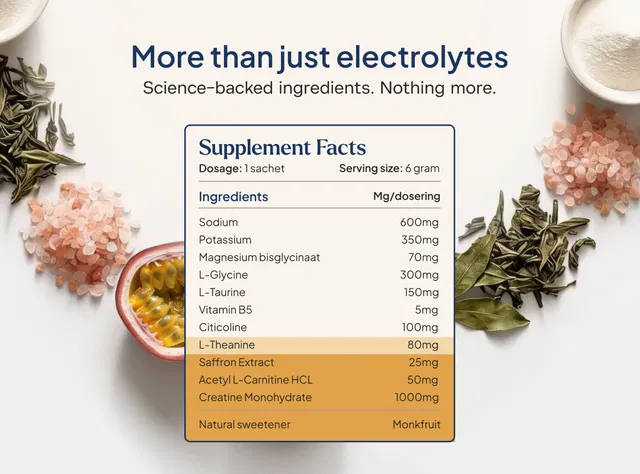 Ingrediënten: Sodium, Potassium, Magnesium Bisglycinate (14%), Creatine Monohydrate, Citicoline, L-Theanine, Saffron Extract, Acetyl L-Carnitine, L-Glycine, L-Taurine en Vitamin B5.